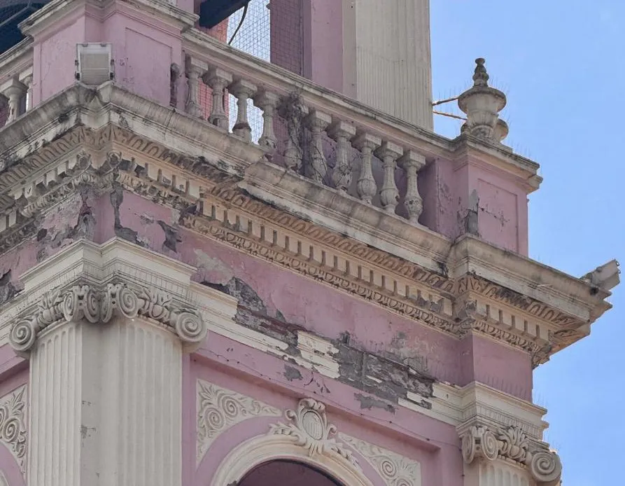 Hay que sumar revoques que se desprendieron, con los relieves incompletos por las partes que faltan y hay que rehacer. En algunos sectores, se ven los centenarios ladrillos asomándose a la expectación de la gente. Y para tener un toque “natural”, hay plantas brotando de su fachada, con sus raíces resquebrajando internamente la estructura y sus ramas afeando su estilo italianizante.