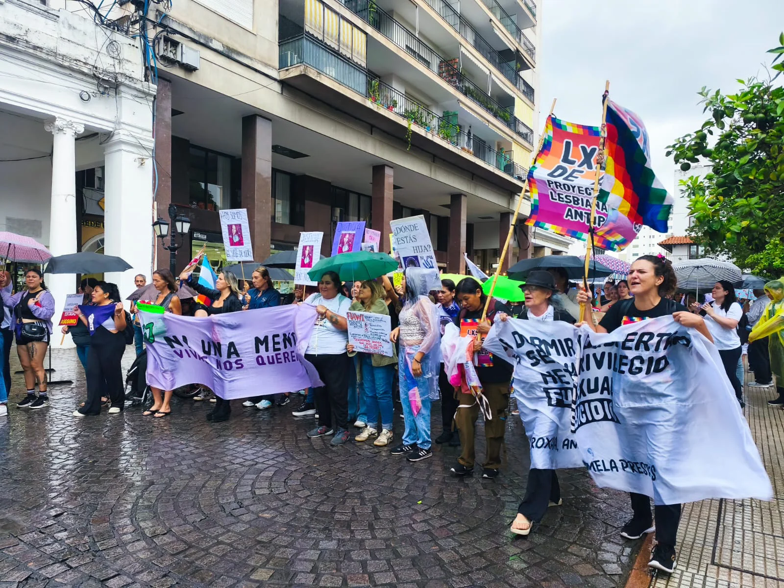 A pesar de la copiosa lluvia que se desató durante la tarde, la movilización avanzó por el centro de la ciudad y recorrió instituciones consideradas clave por las organizaciones convocantes, entre ellas la Legislatura provincial, el edificio de la Jefatura de Policía y la Catedral Basílica.