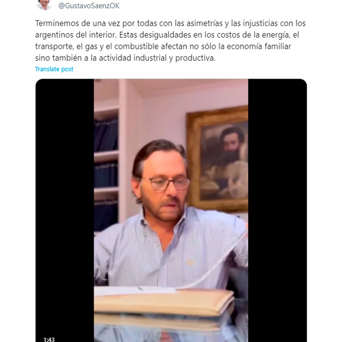 El video que publicó en la red social X está acompañado por un texto que contextualiza la situación. “Terminemos de una vez por todas con las asimetrías y las injusticias con los argentinos del interior. Estas desigualdades en los costos de la energía, el transporte, el gas y el combustible afectan no sólo la economía familiar sino también a la actividad industrial y productiva”, escribió.