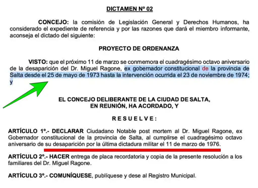 En el visto del proyecto de Farquharson se dice que Ragone fue «ex gobernador [sic] constitucional de la provincia de Salta desde el 25 de mayo de 1973 hasta la intervención ocurrida el 23 de noviembre de 1974».