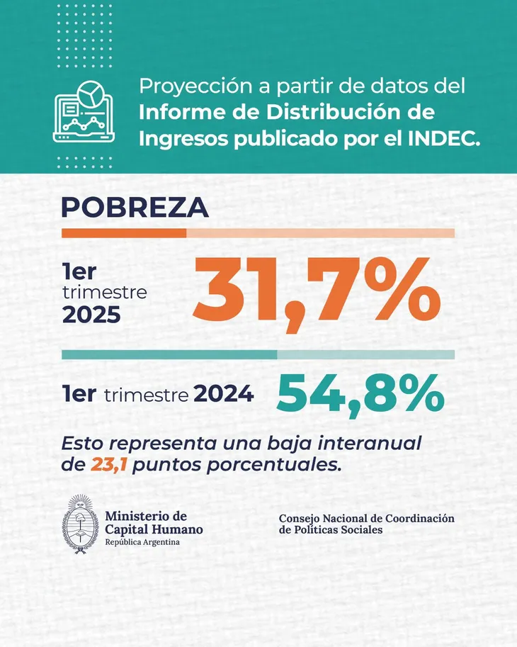 Según destacó Capital Humano en un comunicado, el dato de pobreza representa una baja interanual de 23,1% con relación al primer trimestre del 2024, ya con el gobierno libertario en funcionamiento. Aseguran que en ese período hubo el pico más alto pobreza con una proyección del 54,8%.
