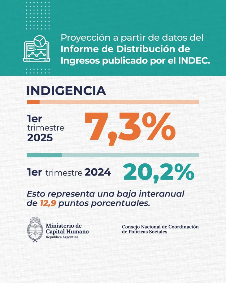 En tanto, Capital Humano destacó que la indigencia llegó al 7,3%, lo que representa una baja interanual del 12,9 pp, teniendo en cuenta que un año atrás fue del 20,2%.
